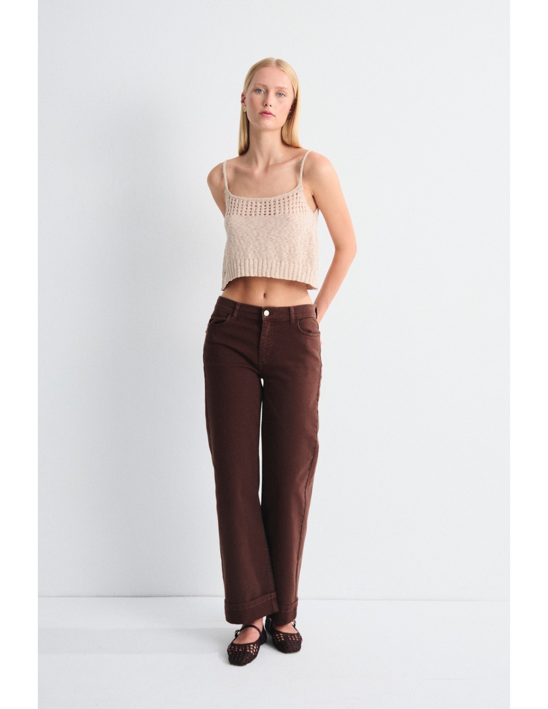Knitted top with thin straps, fancy knit neckline and smooth ribbed body. Discover the Balam family, which is completed with the T-shirt and jumper in the same yarn.