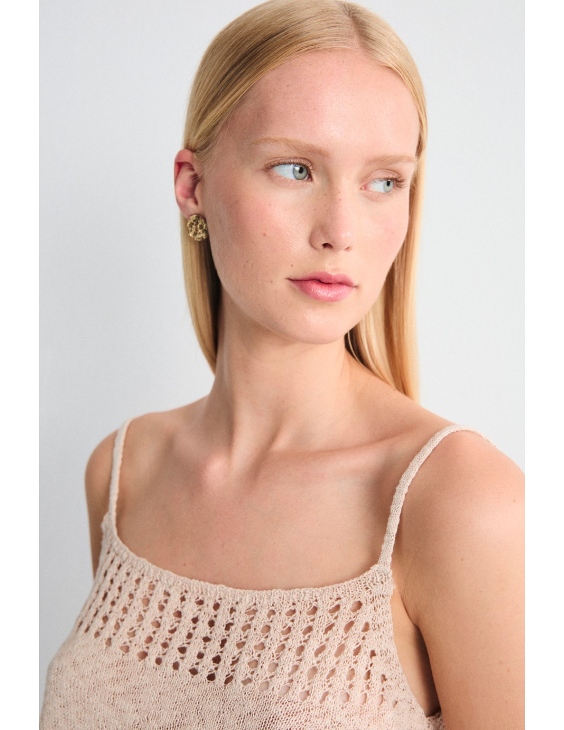 Knitted top with thin straps, fancy knit neckline and smooth ribbed body. Discover the Balam family, which is completed with the T-shirt and jumper in the same yarn.