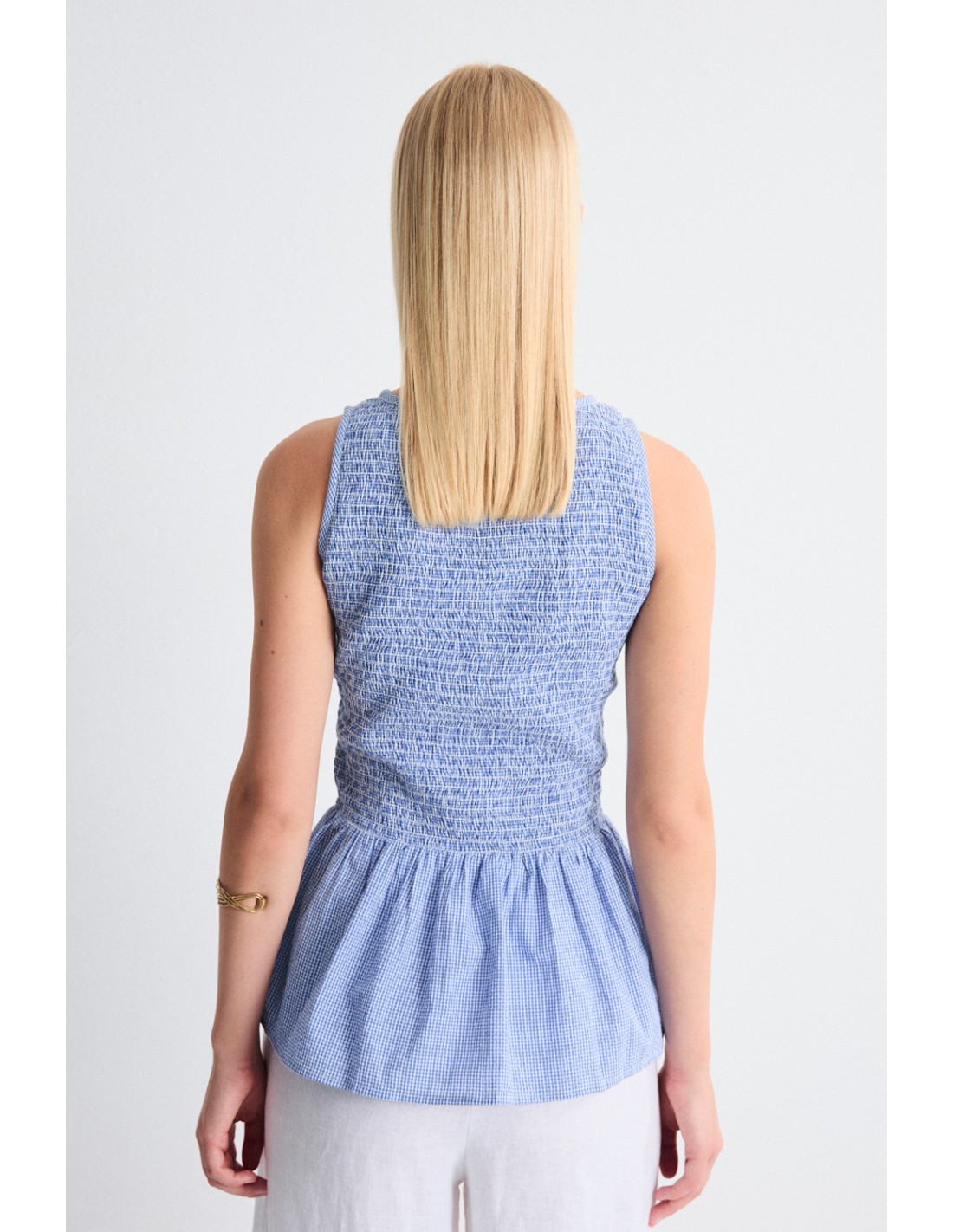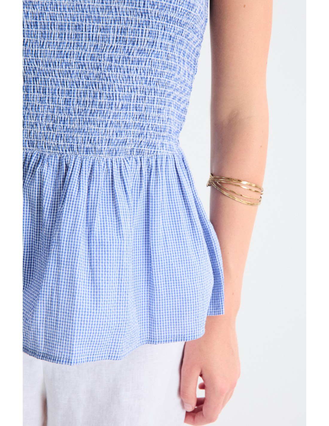 Sleeveless top in special fabric, with honeycomb gathered body and peplum ruffle. Combine it with the Kyra skirt for a cottagecore-inspired total look. Also available the dress from the same family.