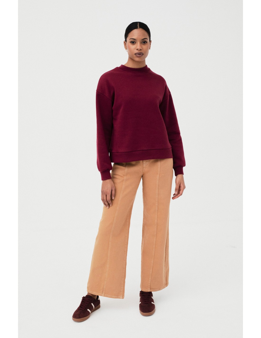Valby is a wide-cut, high-waisted pair of trousers with central seams and contrast stitching. It stands out for its elegant and modern fit.