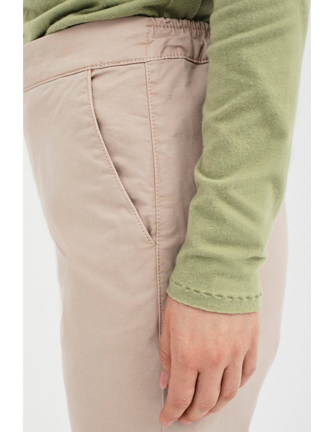 Chino trousers with flat front waistband and flat back elastic band. Diagonal pockets on front and back pockets with bias tape.