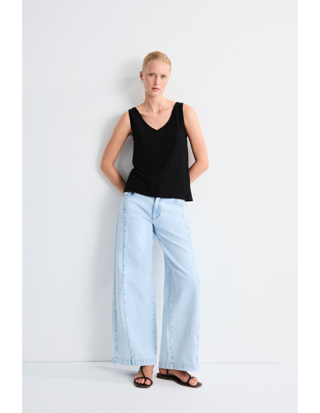Low rise, long denim trousers with metal button closure, central seam detail and wide leg. A modern silhouette with a seventies look.