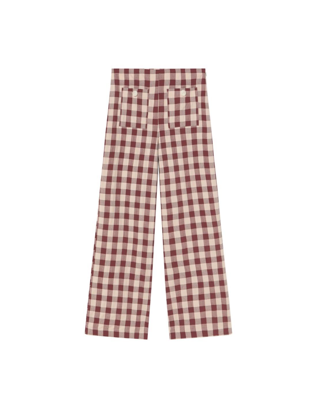 Vichy culotte trousers with flat back elastic, invisible zip on the side and front pockets with button. Match with Marlene blouse and Whitehall bag.